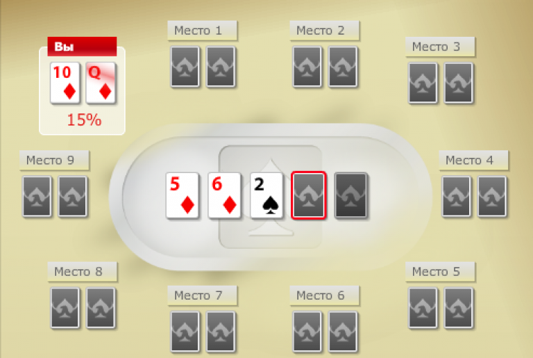 Даже в случае улучшения Вашей руки на терне, Вы не сможете быть спокойными, так как оппонент имеет неплохую возможность на ривере сложить флеш или любую другую мощную комбинацию. Также как и при открытом стрит-дро, «дырявый» стрит может использовать одну или обе карманные карты.