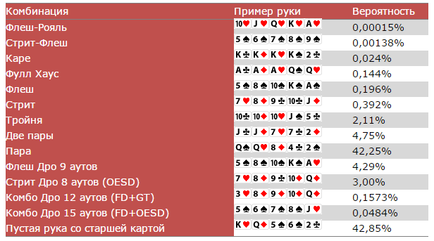 А значение вероятности того, что выпадет открытый стрит, имеющий пару оверкарт, составляет половину из всех возможных игровых комбинаций. Поэтому, в конечном итоге, вероятность на победу и на проигрыш имеет одинаковые значения.