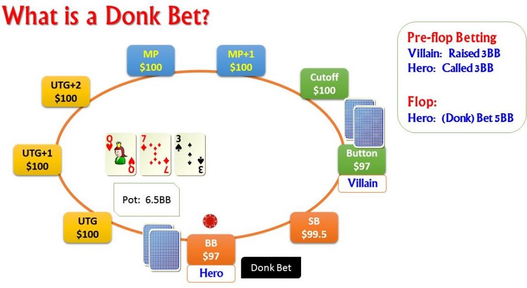 Противоположное понятие контбету это донкбет, «ослиная ставка», первая, от коллировавшего на префлопе игрока, ставка на флопе, сделанная против префлоп-агрессора. Этот очень опасная и невыгодная ставка.