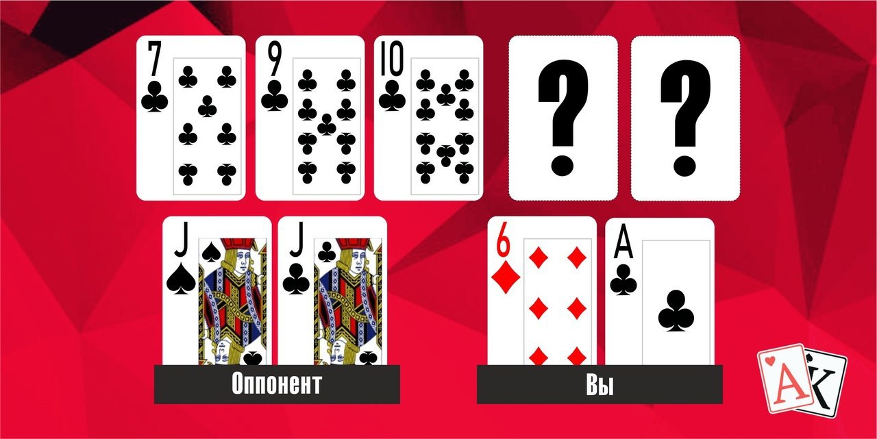 Таким образов, в колоде всего пятнадцать карт, которые могут улучшить руку оппонентов. Вероятность того, что одна из пятнадцати карт выпадет на игровой стол, составляет 54%. Однако даже в этом случае, определенное количество аутов у Вас останется.