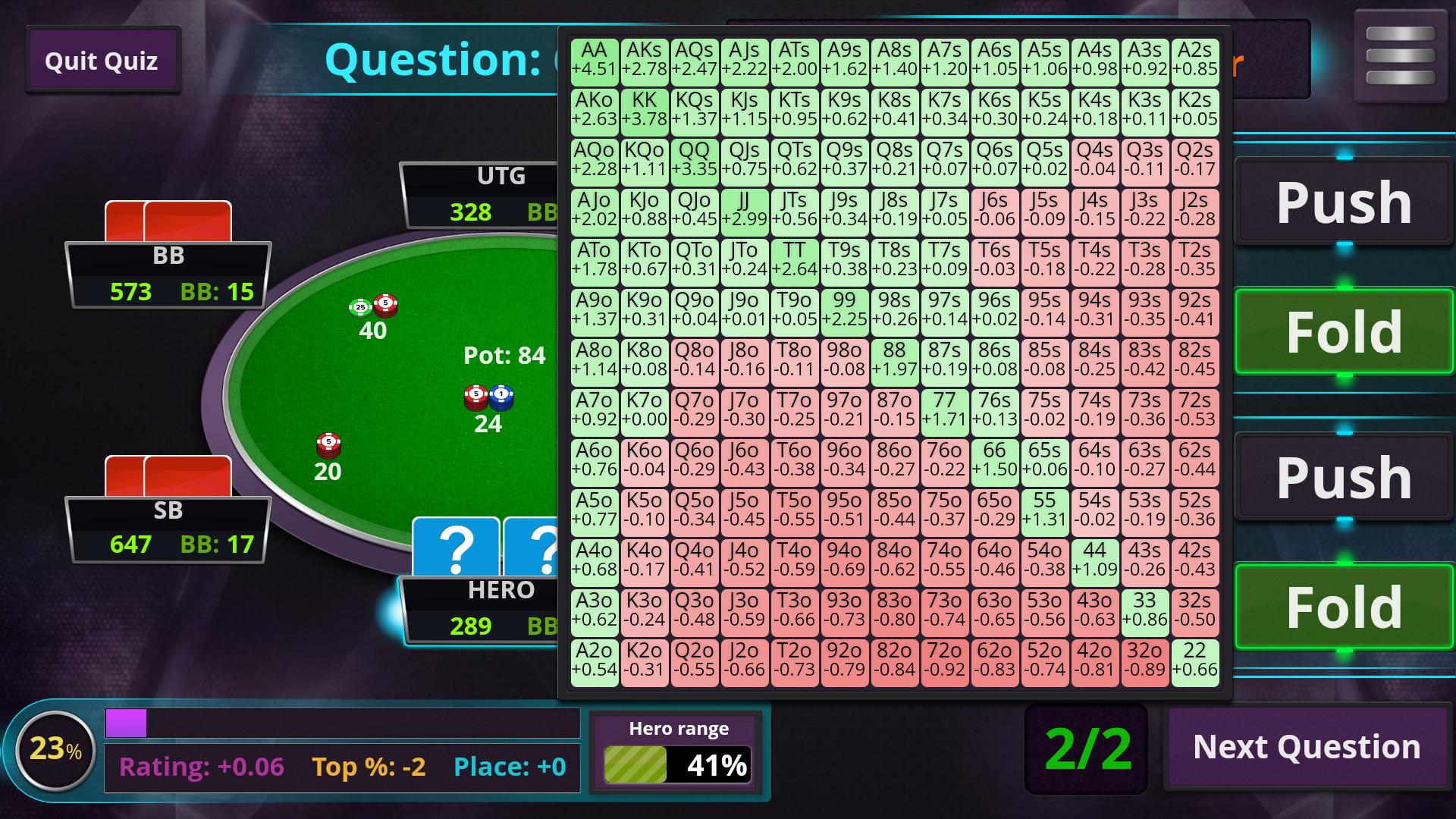 Для ответа на данный вопрос, специалисты покера, основываясь на математические расчеты, составили специальные таблицы (чарты) стартовых комбинаций, которые дают возможность новичкам принять верное решение на стадиях пуш-фолда.