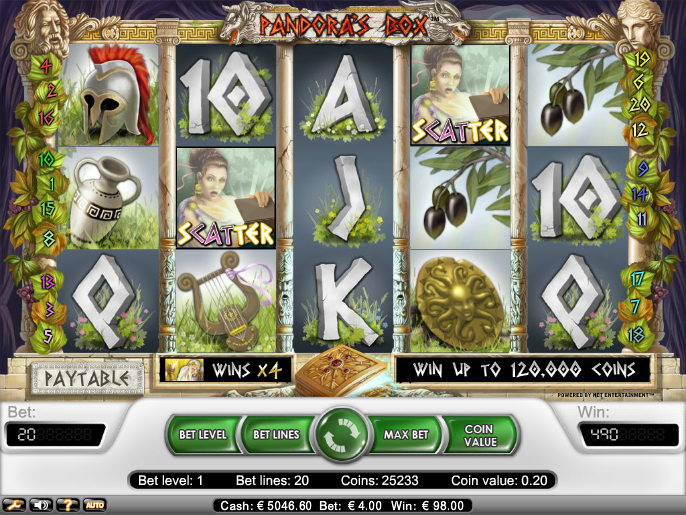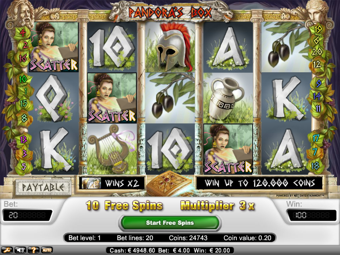 Pandora's Box это пятибарабанный игровой слот от компании Net-entertainment Video Slot с 20-ю линиями выплат, диким символом, рассыпным символом, множителем, бесплатными вращениями, а максимальный джек-пот составляет $40,000.