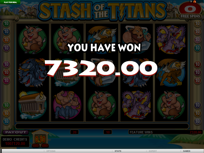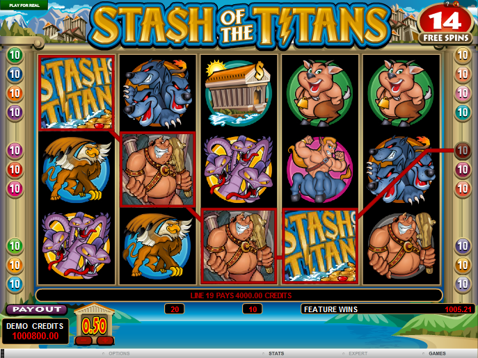 Stash of the Titans – это пяти барабанный не прогрессивный слот от компании Microgaming Video Slot, с 20-ю линиями выплат, диким символом, рассыпным символом, множителем, бесплатными вращениями и джек-потом в размере 10,000 монет.
