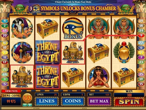 Throne of Egypt это пяти барабанный, непрогрессивный слот от компании Microgaming Video Slot. В игры есть дикий символ, символ разброса, бесплатные вращения, бонусная игра, а максимальный джек-пот составляет $10,000.