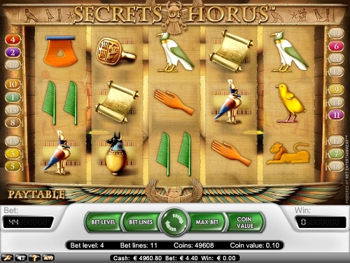 У слота Secret of Horus пять барабанов и 20 линий выплат, игра была сделана на древнеегипетскую тему, а главным персонажем данной игры является, древне египетское божество Хор, сын Осириса. У данной игры есть все прелести современных слотов, от дикого символа до множителя, но, к сожалению, отсутствует бонусная игра. Панель управления слота такая же, как и у остальных слотов NetEnt. Кроме того, присутствует кнопка остановки барабанов. Барабаны выглядят, как пять папирусов перед двумя колоннами, а над ними висит каменная пластина с древнеегипетскими иероглифами. Под барабанами находится большой священный скарабей.