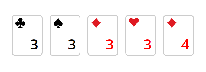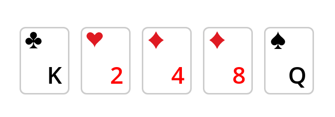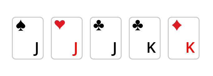 1. Five of a kind. Пятерка - пять карт одного достоинства, существует в играх, где используется Джокер. Например, Q♠ Q♥ Q♣ Q♦ Jkr. Эта комбинация ранжируется выше флеш-рояля.