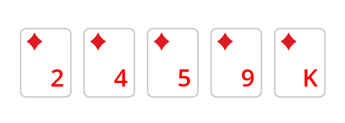 Флеш - пять карт одной масти в любой последовательности, например K♣ Q♣ 7♣ 4♣ 2♣. В одной раздаче не может быть флешей двух разных мастей, потому что обычно три или четыре карты стола будут общими для игроков.