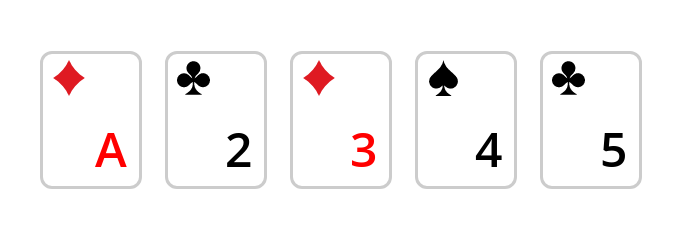 Здесь нужно быть внимательным, ведь туз может быть использован как в начале, так и в конце последовательности, и это единственная карта, которая работает таким образом. Самый высокий стрит - это A, K, Q, J, 10, его обычно называют бродвейским. Самый низкий - 5, 4, 3, 2, A, называется бэби-стрит, велосипед или колесо.