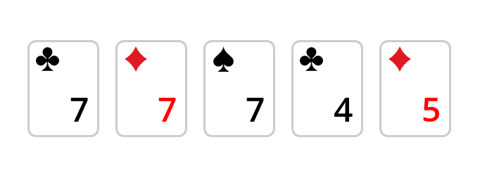 Всего возможно собрать 54 912 комбинаций троек, от трех двойок до трех тузов. Вероятность собрать эту комбинацию составляет 2,1128%.