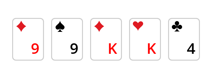Две пары - это комбинация, состоящая из двух карт одного достоинства, плюс двух других карт другого достоинства, плюс одной дополнительной карты, являющейся кикером. Например, 9♣ 9♠ 10♥ 10♦ А♦.