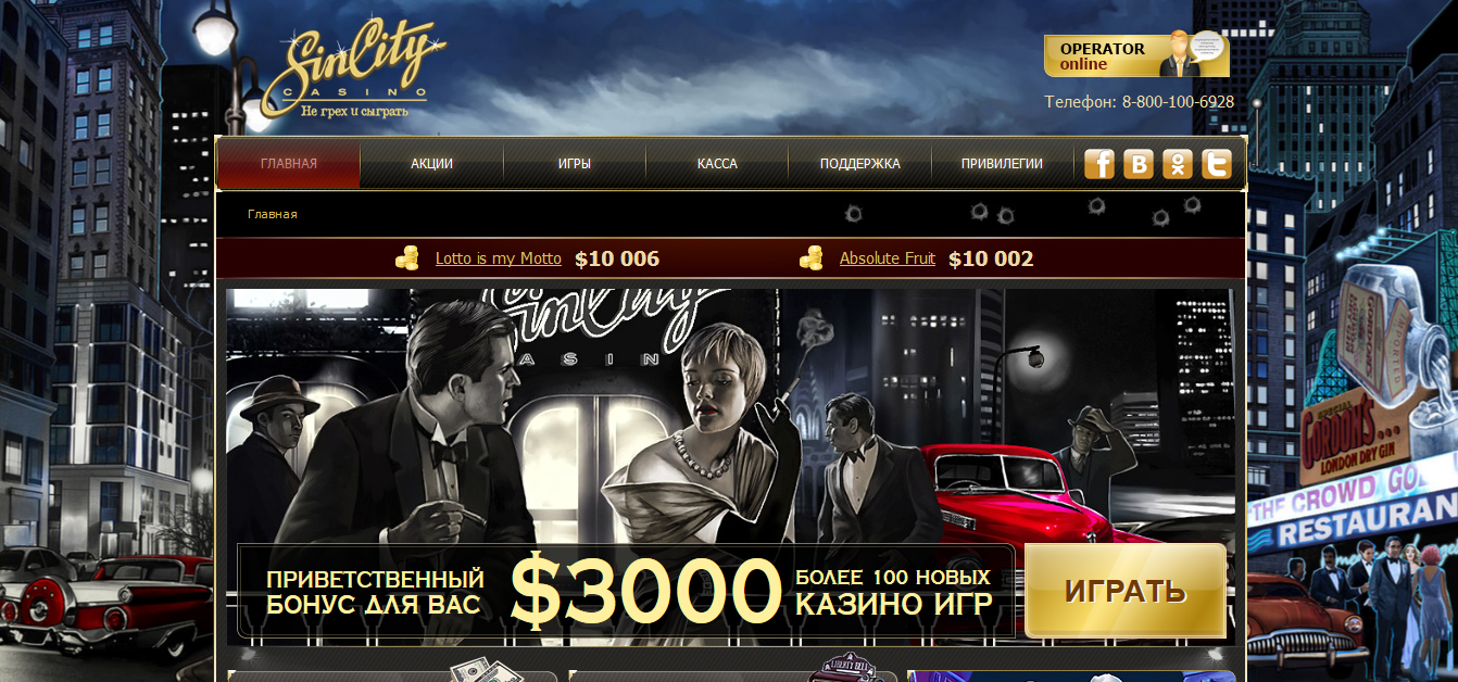 Уважаемые азартные игроки, приглашаем вас в онлайн казино «Город грехов». Если вы мечтаете о крупном выигрыше, то вам именно сюда. Реалистичность этого игорного заведения поразит даже самых искушенных пользователей.