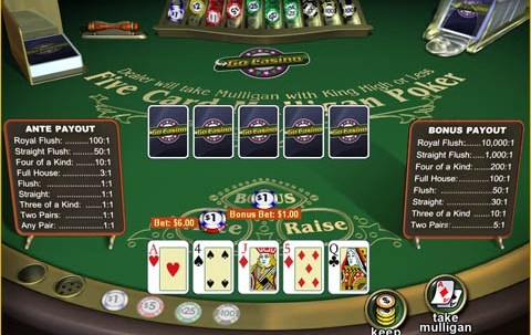 Вот представьте себе карточный покерный стол, на котором лежат десять карт, пять у игрока и пять у дилера. При этом игрок видит четыре карты крупье. И теперь его задача сделать правильный ход, один из трех возможных, а именно, либо сбросить карты, либо их поменять или же сделать ставку. Если игрок принимает решение сбросить карты, ему приходится раскошелиться, ведь каждая замененная карта обойдется ему в один Анте.