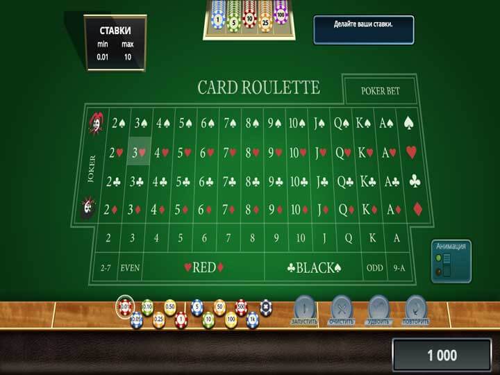 Карточная рулетка (Cards Roulette) – неординарный и достаточно интересный Cards Roulette Вы можете ставить на отдельные карты, а также на масти (бубны, трефы и т.п.). Помимо этого, Вы можете поставить на Джокера. Также можно ставить на четные или нечетные, красные или черные. Специальное поле – Poker Bet разрешает делать Вам ставки на покерные комбинации. Благодаря этому, карточная рулетка является интересной и увлекательной. В ставках ограничений нет, если Вы ставите на разные виды. За один раз можно поставить как на покерную комбинацию, так и на рулеточную. Существует очень много комбинаций. Для того чтобы не запутаться, была создана таблица выплат.