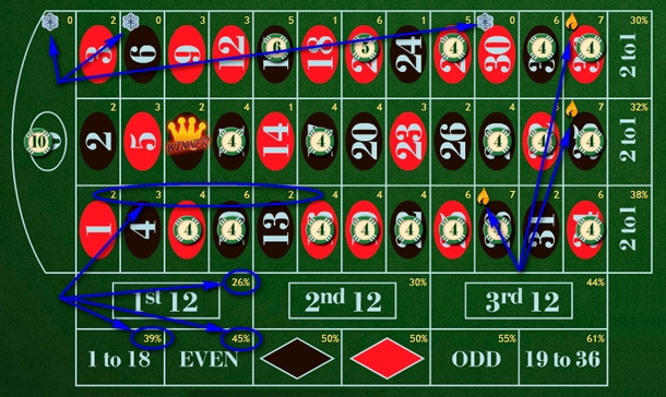 Даже если это случилось, в следующем раунде или двух, ну максимум трех, Вы отыграете свои деньги и начнете получать доход. Неплохо, правда? А если в Вашей игре вообще выпадет одно из двух центральных чисел, то Ваш выигрыш увеличивается в семьдесят два раза – замечательный результат, чего и Вам желаем!