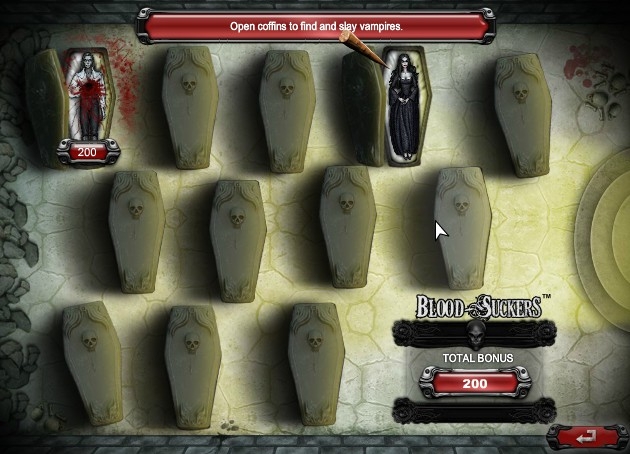 Дизайн игрового автомата довольно мрачный, каким и должно быть логово вампира. Особенно угрюмой выглядит бонусная игра, во время которой вы попадаете в склеп, где рядами стоят гробы со спящими вампирами. Надо сделать все, чтобы они никогда не проснулись. Методы просты и известны каждому охотнику на вампиров. Открываете гроб и вонзаете кол в сердце кровопийцы. Все это сопровождается аутентичными звуками. Вы слышите звуки отодвигаемой тяжелой крышки гроба, как вонзается в вампира кол, как растекается его кровь и разлетаются летучие мыши из пустых могил. На заднем фоне слышен кладбищенский звон колокола, и вам становится по-настоящему жутко. Но хорошие бонусы помогут вам преодолеть ваш страх. Риск того стоит. Когда речь идет о хорошей выплате, вы забудете о том, как вам страшно и продолжите схватку с вампирами. Летучие мыши прекращают бонусную игру, и вы возвращаетесь в интерфейс основной игры. В игре можно получить 175 ставок, что довольно неплохо для бонусных игр, в которых выбор предметов сопровождается немедленными выплатами.