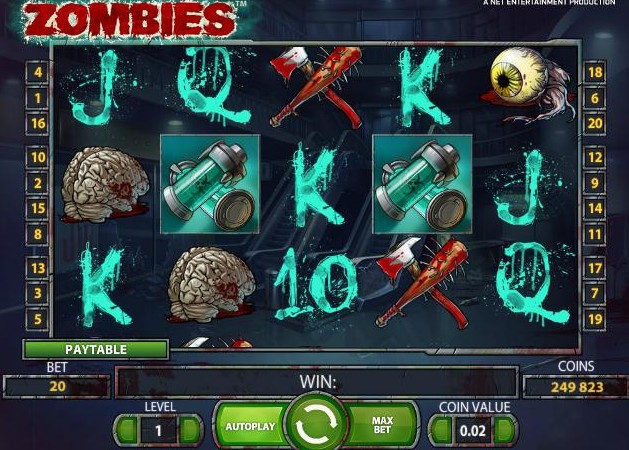 Есть еще у Net Entertainment игра про зомби, вышедшая в 2012 году. Здесь на барабанах настоящий хардкор: глаза, мозги, окровавленные топоры с дубинками для уничтожения зомби, бензопила, маска, контейнер с вирусом. На заднем фоне ужасающие звуки, похожие на шепот, то ли еще что, но в целом становится немного жутко. Как раз на это и был расчет. Пятибарабанный игровой автомат Zombies с 20 линиями выплат были созданы для того, чтобы вы почувствовали атмосферу, напоминающую по духу мир Resident Evil. Вы видите ужасные лица мертвяков, а к вам тянутся холодные, страшные, окровавленные руки. Если хотите от них увернуться, в этой игре есть полный арсенал нужных средств.
