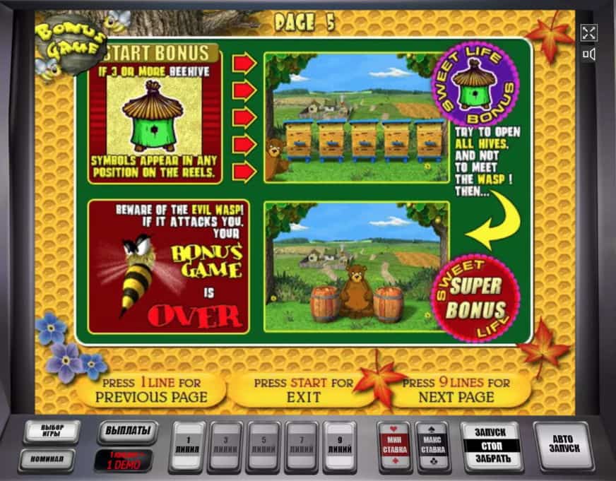 Когда на мониторе появляются три символа с картинкой пасеки, значит, вам предоставляется супер-игра. Медведь будет находиться возле пяти пасек. В одной из них спрятана оса, а в остальных – сладкий медок для медведя, и, безусловно, супер-призы для вас.