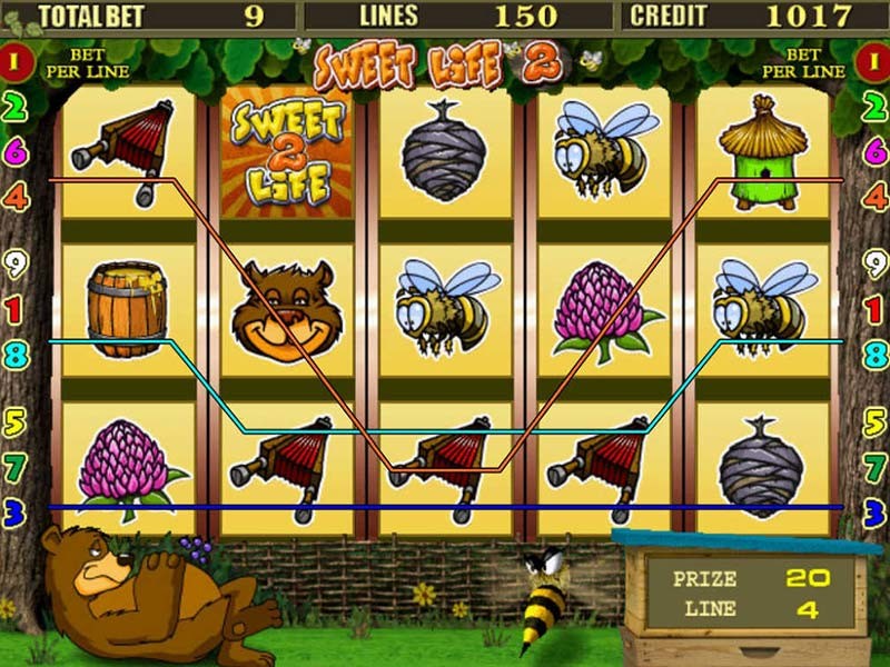 Красочный и несколько детский игровой автомат Sweet Life 2, предлагает вам побывать в роли радостного медведя на пасеке, соты которой наполнены медом.