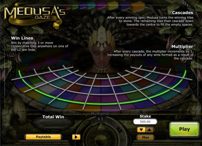 Игра построена по следующему принципу. На игровом поле должно появиться не меньше трех одинаковых фрагментов по двенадцати активным линиям выплат. В этом случае Медуза оживет и цветные фрагменты будут превращены в камень, после чего они обрушатся и вместо них появятся новые фрагменты.