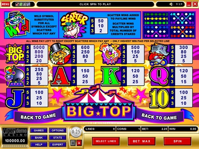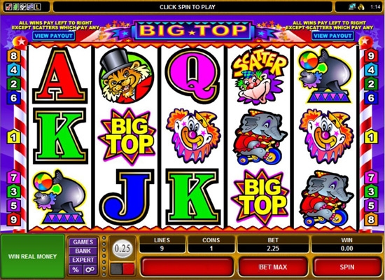 Детство – это сказочный период, пожалуй, самый лучший в жизни человека. Только вспомните эти всевозможные сладости, веселье и радость. Хотите вернуться в свое детство? Сделать это хотя бы на некоторое время вам позволит игровой автомат под названием «Big Top». Это идеальный слот для безумных романтиков, которые скучают по лучшим моментам своей жизни. Лучшие акробаты и клоуны будут лично выступать для вас в цирке, дрессированные животные выполнят несколько невероятных трюков, а фокусники покажут на арене настоящее волшебство. Возможно, вы и сами освоите парочку трюков, которые сможете потом демонстрировать своим близким. Общее описание игрового автомата Большой топ поведает вам основную информацию о нем.