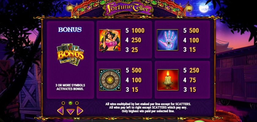 Мистический видео слот Fortune Teller погрузит вас в мир тайн и загадок. Игра требует постоянного внимания, нужно быстро принимать решения, полностью довериться своему шестому чувству. Как правило, интуиция и удача не подводят в таких ситуациях, поэтому извлекайте из этого максимальную выгоду!
