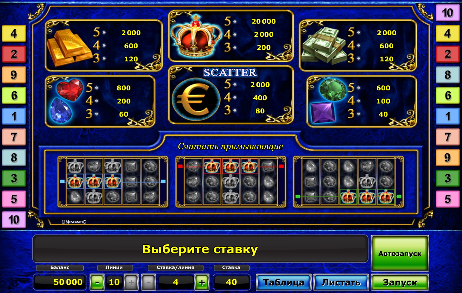 Символ разброса «евро» очень важный при ставке в бонус в игре. Так как игроку при удачном выпадении трех символов «евро» на линиях автомата ставка увеличивается на 500 и умножается на максимальное количество символов. Следует отметить, что других бонусных игр и дополнительных символов нет.