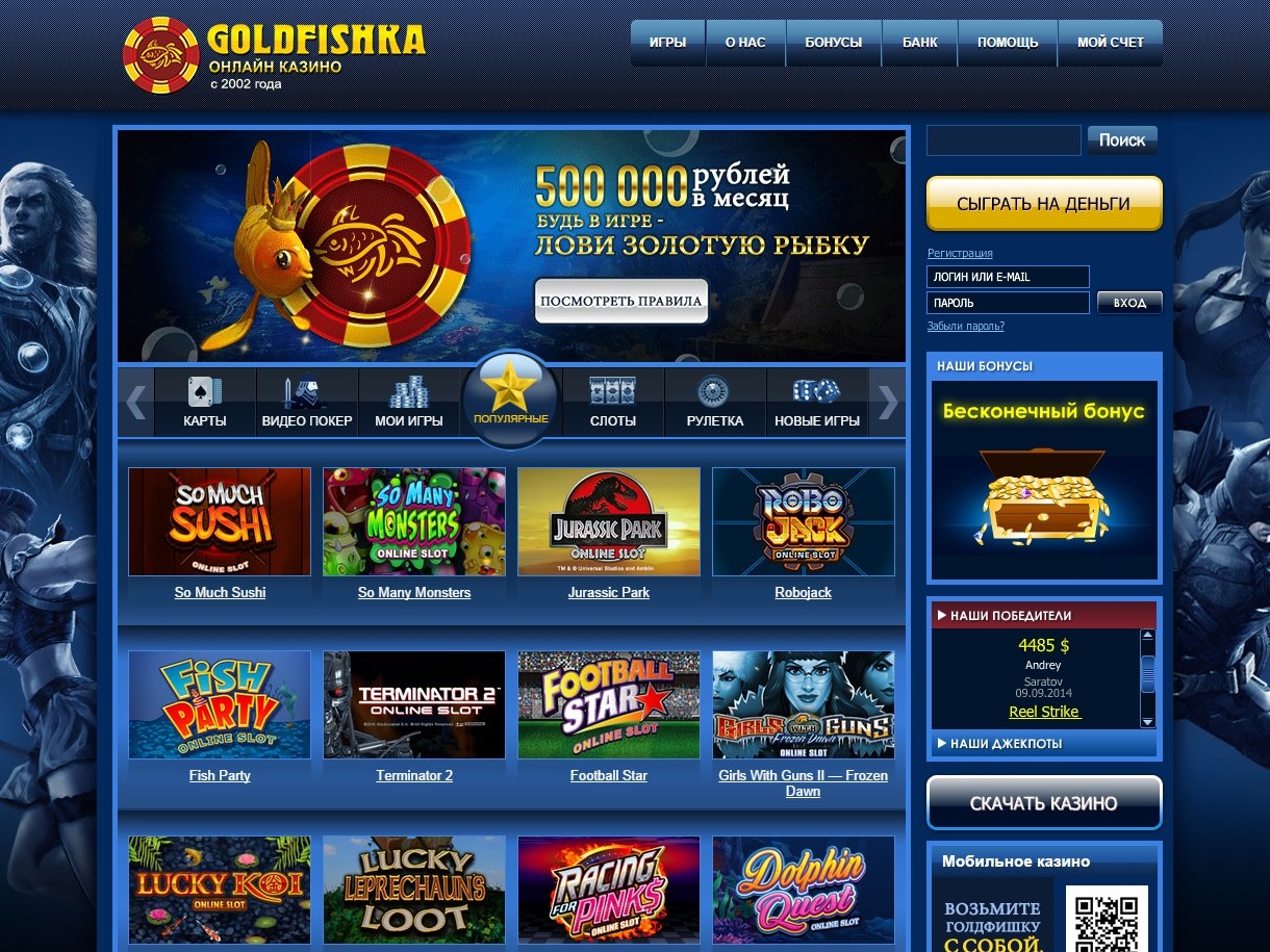На сегодняшний день в онлайн казино Голдфишка представлено более 520 разнообразных великолепных игр и это количество постепенно растет. Играть можно не только с ПК, но и в скачиваемой версии казино Голдфишка.