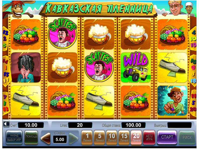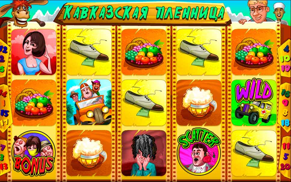 Слот Кавказская пленница состоит из пяти барабанов и двадцати линий выплат. Символами игрового автомата являются непосредственно все герои известной комедии: