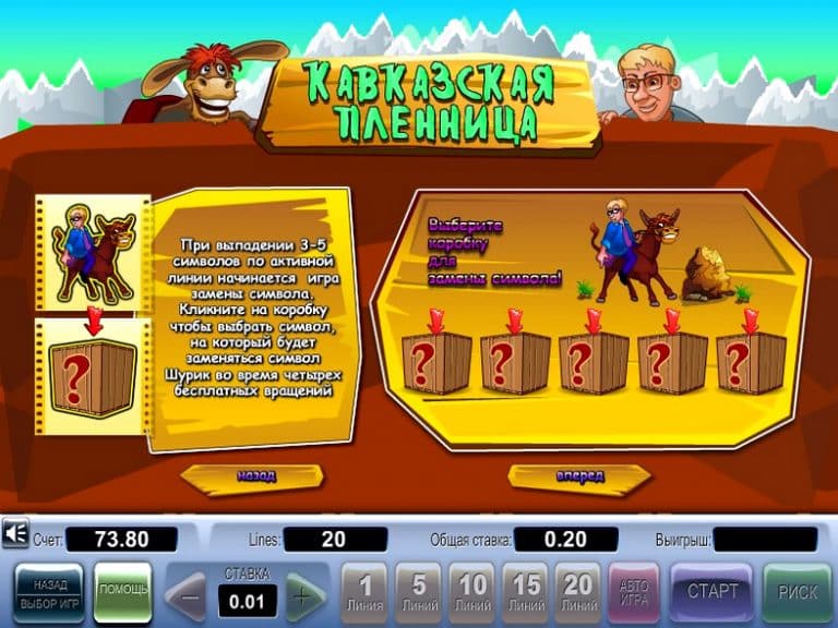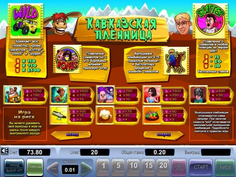 Удваивает удовольствие от игры и дизайн слота Кавказская пленница. Все изображения сделаны в яркой окраске. Не расстраивает и музыкальное сопровождение игры.