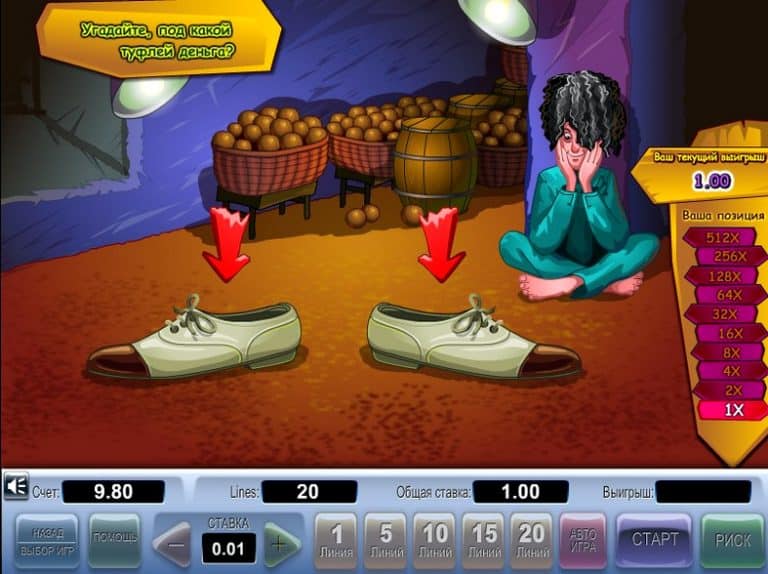 В риск игре нужно отгадать ботинок, под которым лежат деньги. Если вы найдете купюры, удвоите выигрыш. Если же ошибетесь - потеряете все.