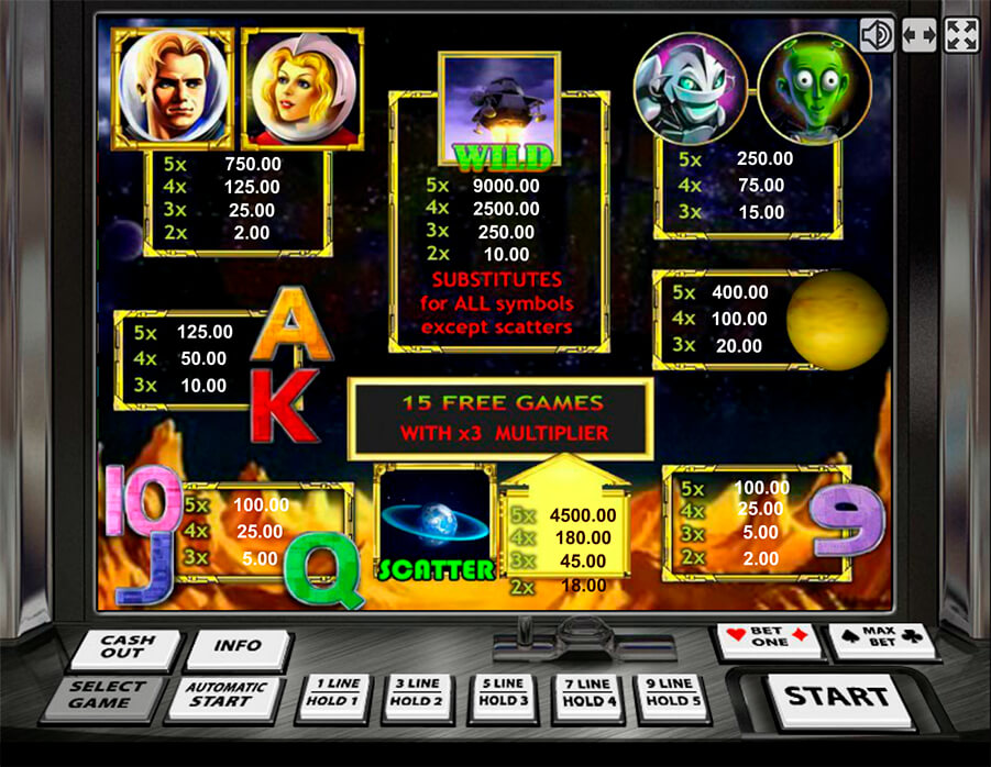 Эта игра поможет ознакомиться со строением космического корабля. На пяти барабанах расположились девять линий выплат, число которых каждый игрок определяет для себя сам. Среди специальных возможностей видеослота можно назвать: