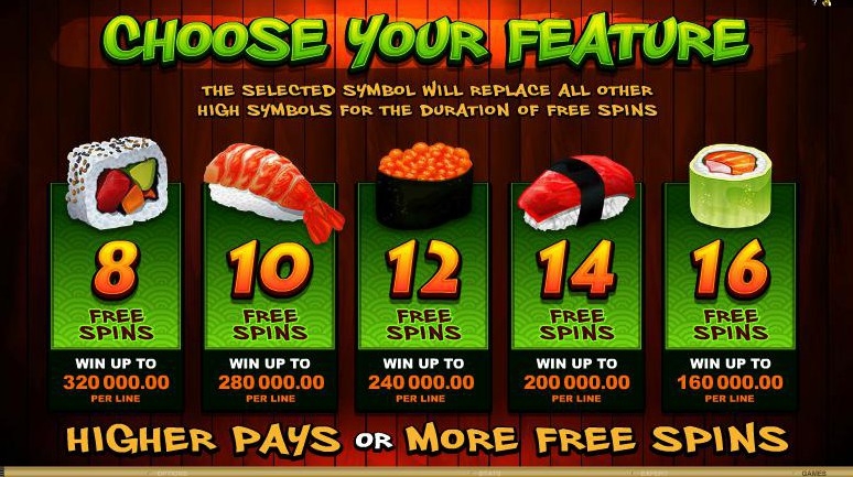 Как и предыдущий слот, здесь 5 барабанов, 25 линий выплат, и суши, которых может оказаться очень много, если один из основных символов начнет делиться, увеличивая ваш выигрыш. Приятный логотип игры в виде названия игры на фоне палочек для еды является диким символом в игре, а символом разброса стал рыбный соус. Основными символами стали суши и роллы разных видов. Слот смотрится очень аккуратно. Некоторые символы анимированы, что придает динамичность игре. Например, вы можете увидеть, как соус и васаби крутятся и меняются местами. Игру сопровождает музыка, которая ускоряется во время бонусной игры. В этой игре можно выиграть до 64 тысяч монет, так что видите, на что способны суши, если в них поверить.