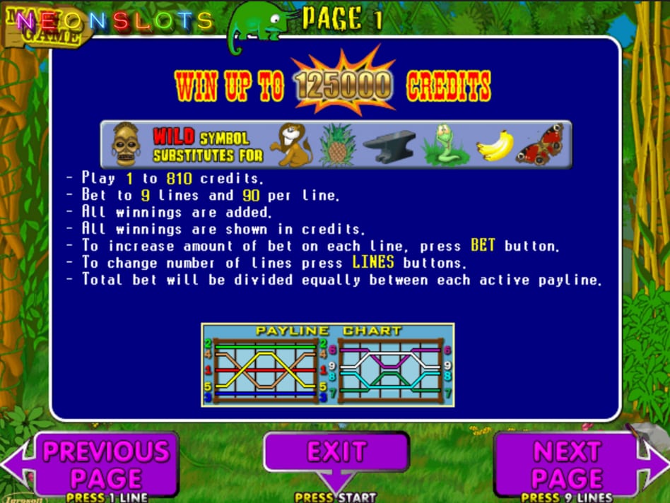 Максимально дорогостоящим является символ обезьяны, предоставляющий выигрыш в 5000 кредитов за пять выпавших одинаковых знаков на неактивных линиях.