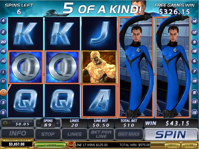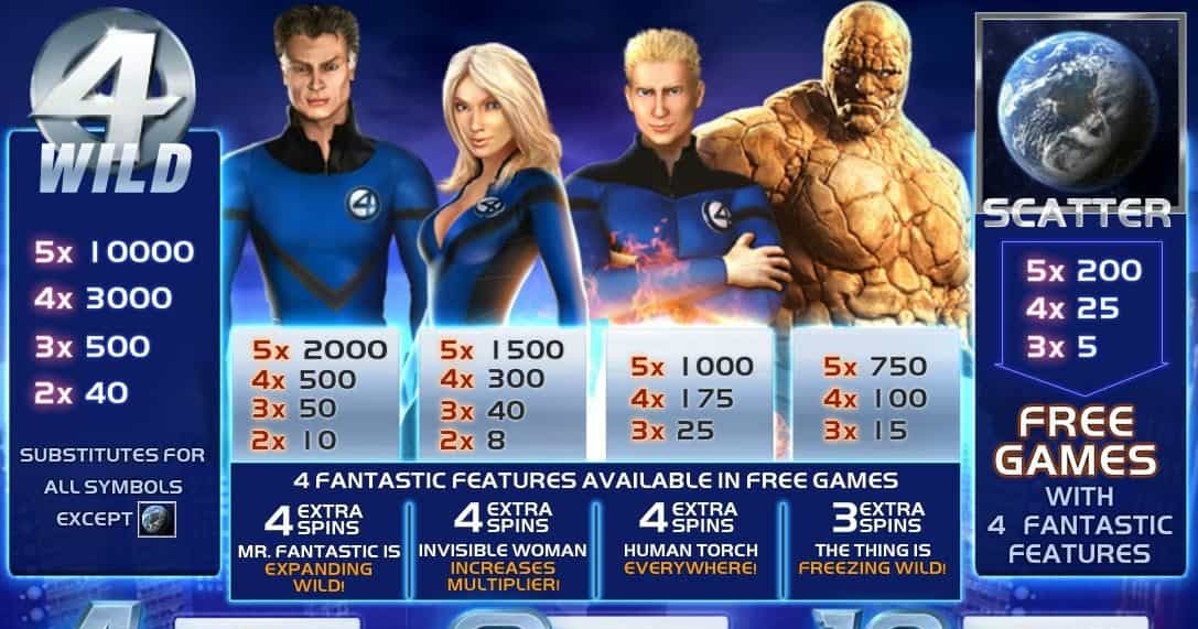 Как вы помните, в героической четверке главным является мистер Фантастик, и именно выигрышные комбинации с его изображением наиболее порадуют вас в финансовом плане.