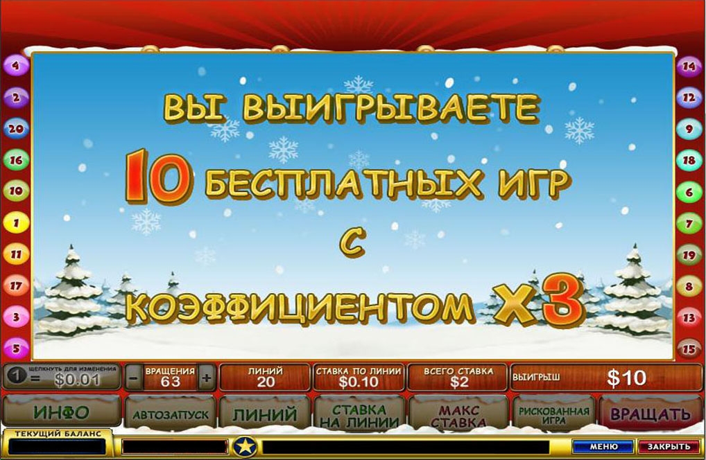В новогоднем автомате возможно поставить на каждую из двадцати линий от 1 до 10 кредитов, то есть, максимальная ставка может увеличиваться до 200 кредитов соответственно.