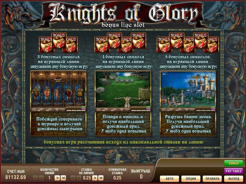 Бонусная игра – это не только турнирное состязание между рыцарями, но и меткая стрельба по мишеням. В случае победы вас будет ждать хорошее вознаграждение!