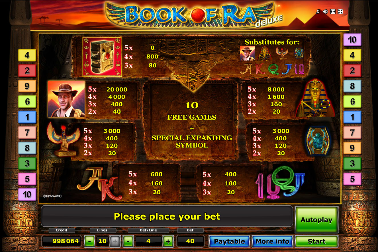 Среди игроков известно и другое имя этого видео слота – «Книжечки», и такое название не случайно. Таинственная книга с рубином выполняет функции скаттера и дикого символа автомата «Книга Ра Делюкс».