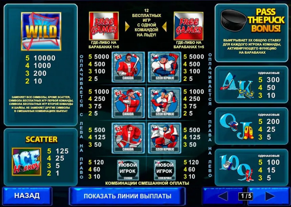 Среди уникальных возможностей слота Ice Hockey – выплаты слева направо для одной команды игроков и обратный порядок для второй.