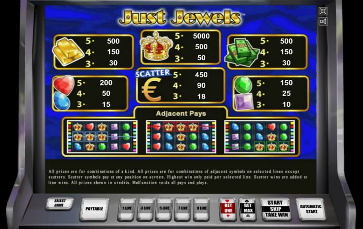 Гаминатор Just Jewels имеет пять барабанов, на которых размещено девять линий выплат, лишь версия Deluxe содержит десять линий. На каждом барабане игровые значки нанесены сериями, посему на протяжении игры барабан частенько оказывается полностью заполненным тем либо иным символом.
