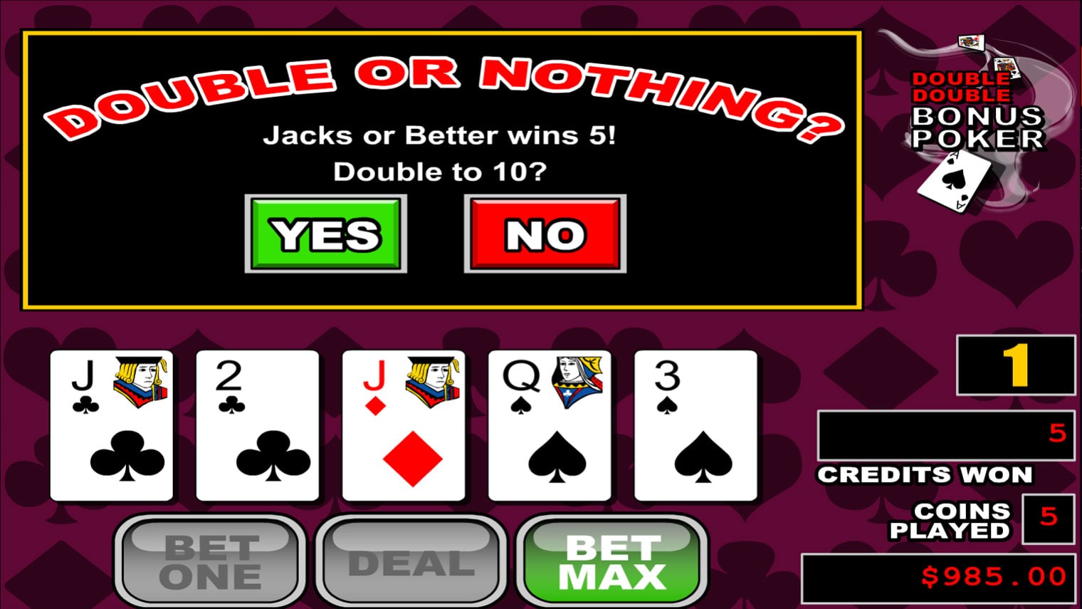 При каждом совпадении любой комбинации, у игрока появляется возможность сыграть в бонусную игру на удвоение. Смысл ее заключается в том, чтобы угадать одну карту из предложенных четырех, так, чтобы ее значение было выше или ниже уже открытой карты.