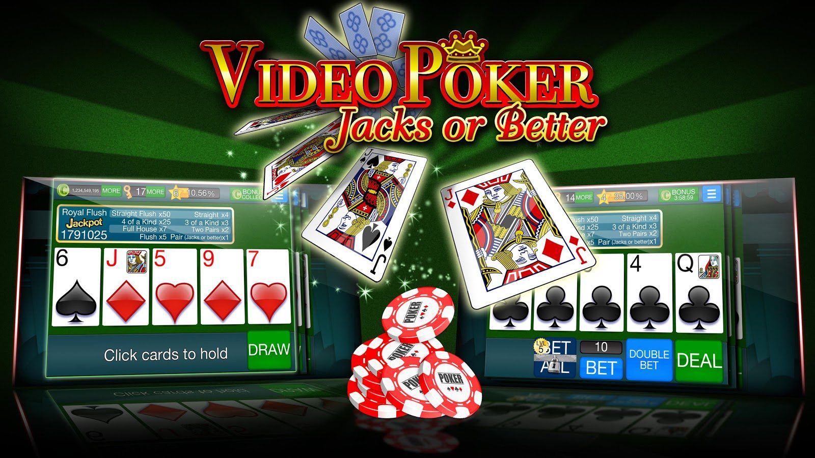 Это все игра с участием джокеров; - по распределению выигрышных комбинаций: десятки и выше, валеты и выше; - с определенными бонусными совпадениями: двойной бонус и тузы и картинки.