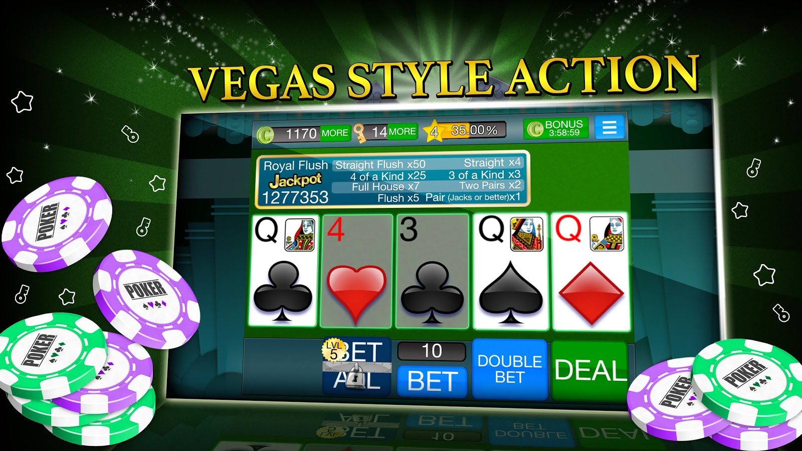 Совет один для всех азартных игроков: Тренируйте свои навыки, изучайте новые тактики и стратегии игры и тогда видео покер вам подарит незабываемые впечатления и замечательные победы.