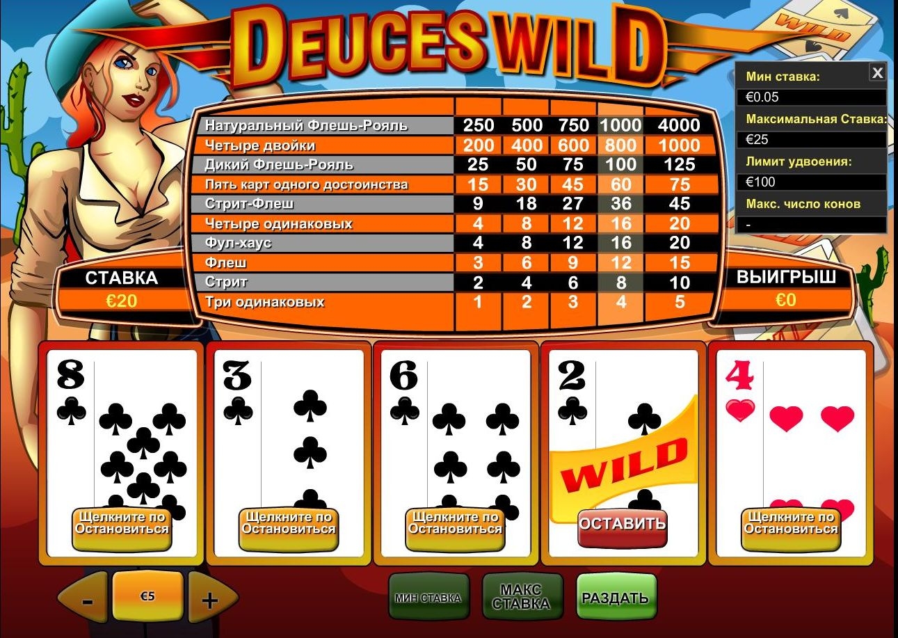 В игре используется стандартная колода из 52 карт (начиная с двоек и заканчивая тузами). Как вы уже могли догадаться, двойки в этом варианте видеопокера являются самыми сильными картами, своеобразными джокерами, которые способны дополнить любую комбинацию, заменив в ней недостающий компонент.
