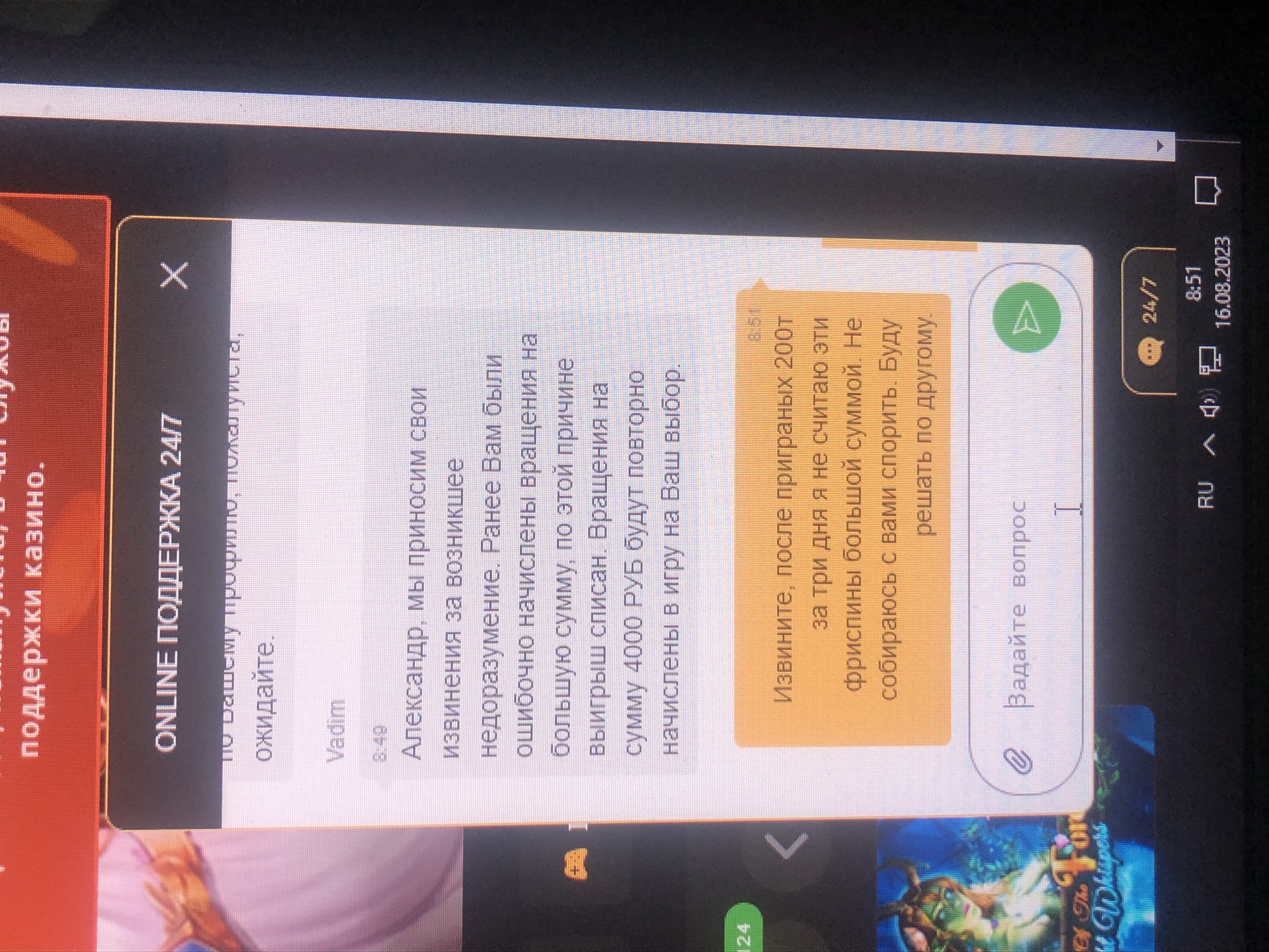 И так, начну с самого начала чтобы все всем было понятно. Каждое свое слово так подтверждать буду скринами. Сегодня 15.08.23 сложилась неприятная ситуация, которую вроде бы как на данный момент решают. За последние 5 дней было слито в казино больше 200т.р (БОЛЬШЕ). Варификация пройдена, был один вывод 5500₽ и то для проверки, остальные выводы отменял сам так как азартный. Сегодня закинул 15 к и слил их. Решил написать в чат дабы узнать сумму кэшбэка проигранных средств за неделю. Сумму мне сказали, а еще предложили фриспины (БЕСПЛАТНЫЕ) дабы успокоить мою душу после таких больших сливов. Оператор на выбор предложил несколько провайдеров и попросил указать слот куда зачислить фриспины. Я выбрал!!!! Это был ПГ слот ХУГО 2. После чего написала мне в чате что фриспины успешно зачислены приятной игры. Я зашел и прекрасно их отыграл, попалось 2 бонуса. В сумме выйгрыш 168100₽. Моему счастью небыло предела так как сегодня я думаю за что платить кредит а тут на тебе?! Чуть больше половины отбито. Ставлю на вывод. И что вы думаете???? Прилетает ВРЕМЕННЫЙ БЛОК! Соседства списывают. Я в недопонимании сразу в чат, а там этот же оператор говорит что мол фриспины эти были начислены по ошибке ( приносим свои извинения) выберете в качестве компенсации фриспины в другом слоте на сумму 4000₽. Я в шоке. Газовать и спорить не вижу смысла. Тоесть у меня тупо сняли 168т и назвали это ОШИБКОЙ. И принесли извинения. И так господа, я 12 лет играю но такого никогда не видел. Что я чувствую не передать словами. НАДЕЮСЬ ЧТО ЭТО ДЕЙСТВИТЕЛЬНО НЕДОРОЗУМЕНИЕ И МНЕ ВЕРНУТ МОЙ ВЫЙГРЫШ. Самое интересное что пока я не возьму эти фриспины которые они сейчас предлагают они не снимают блок. Жду ответа.