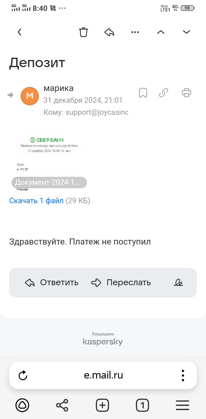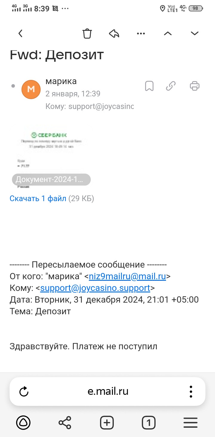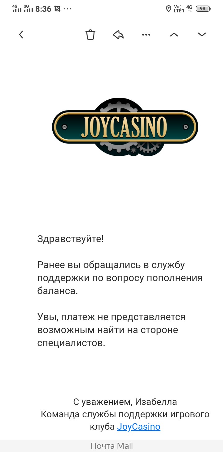 Здравствуйте. 31 декабря пополнила игровой баланс на 1024 руб., но на игровой счёт деньги не пришли . В этот же день был предоставлен чек о списании данной суммы с карты на электронную почту казино , через два дня предоставила выписку по карте. Каждый день писала им на почту , ответ пришел только...