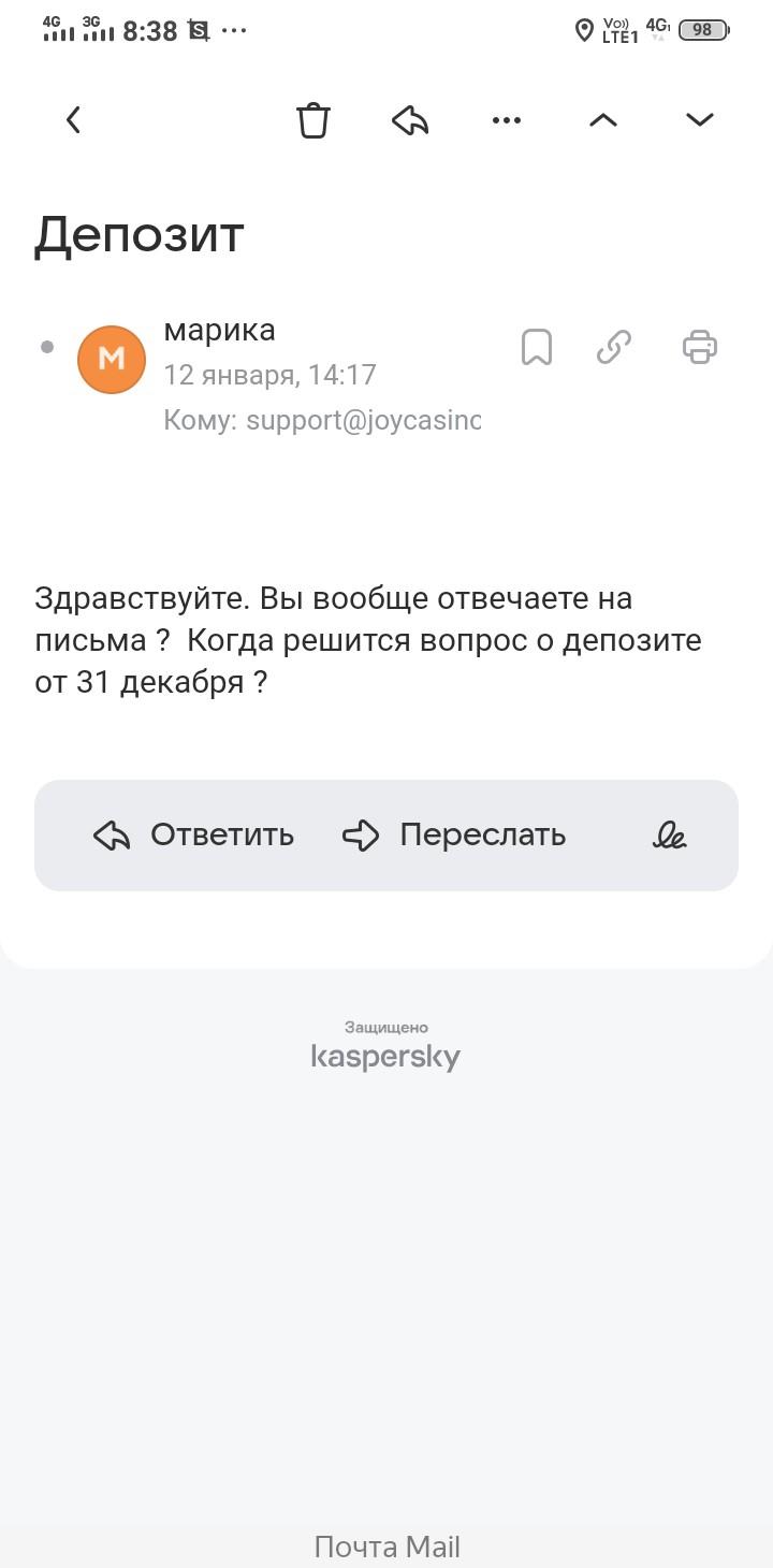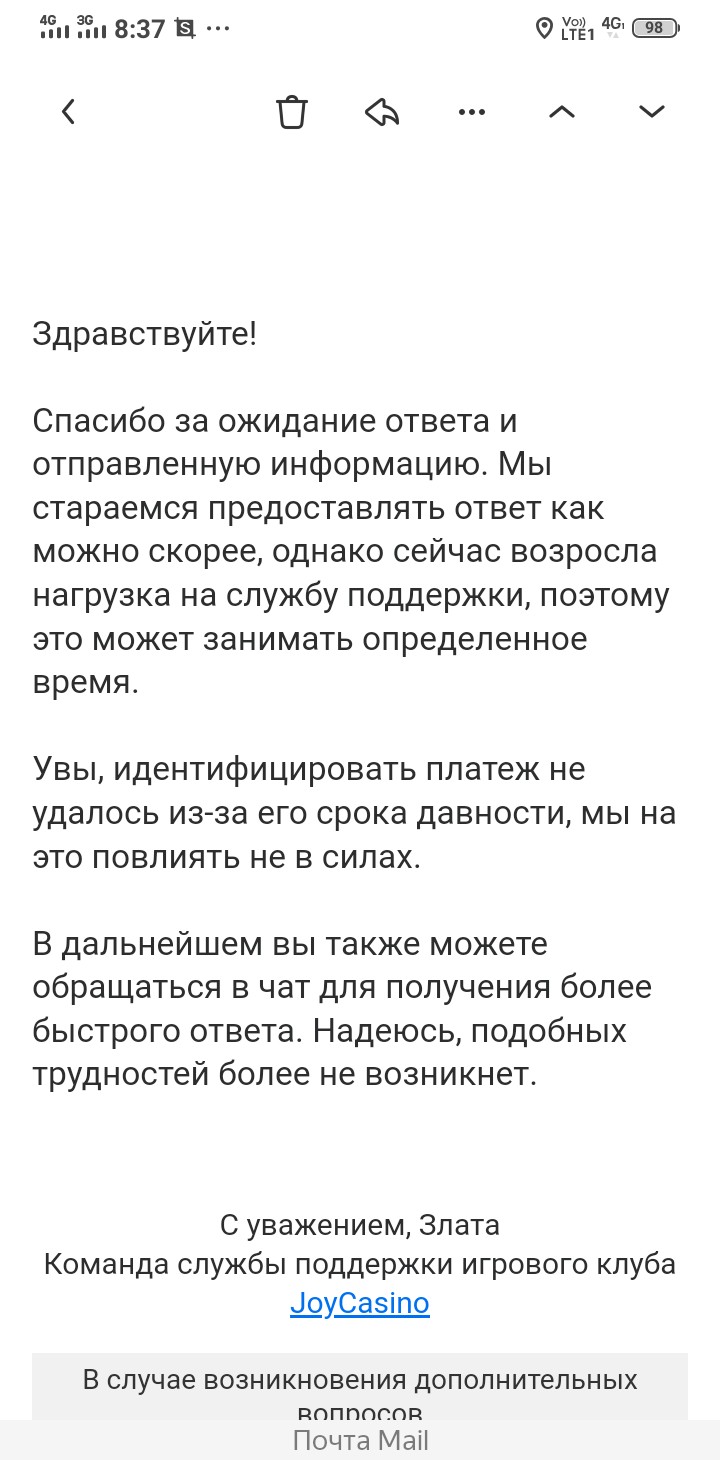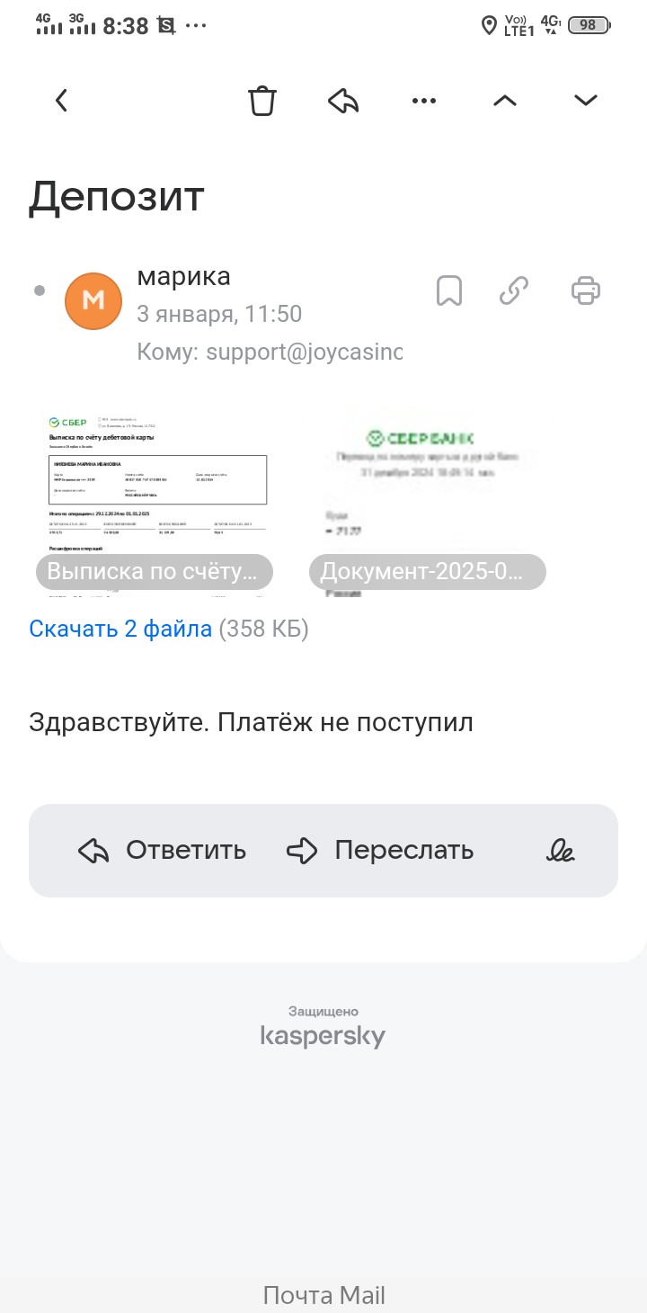 Здравствуйте. 31 декабря пополнила игровой баланс на 1024 руб., но на игровой счёт деньги не пришли . В этот же день был предоставлен чек о списании данной суммы с карты на электронную почту казино , через два дня предоставила выписку по карте. Каждый день писала им на почту , ответ пришел только...