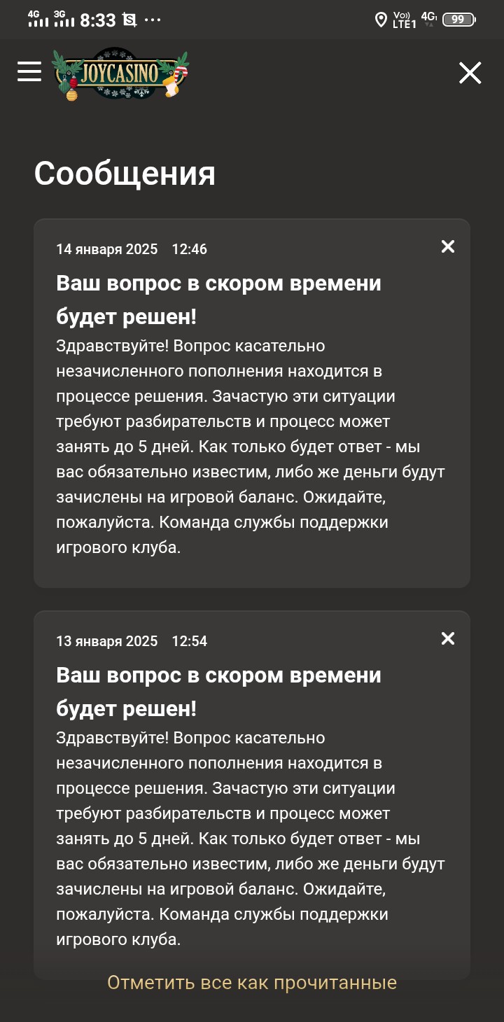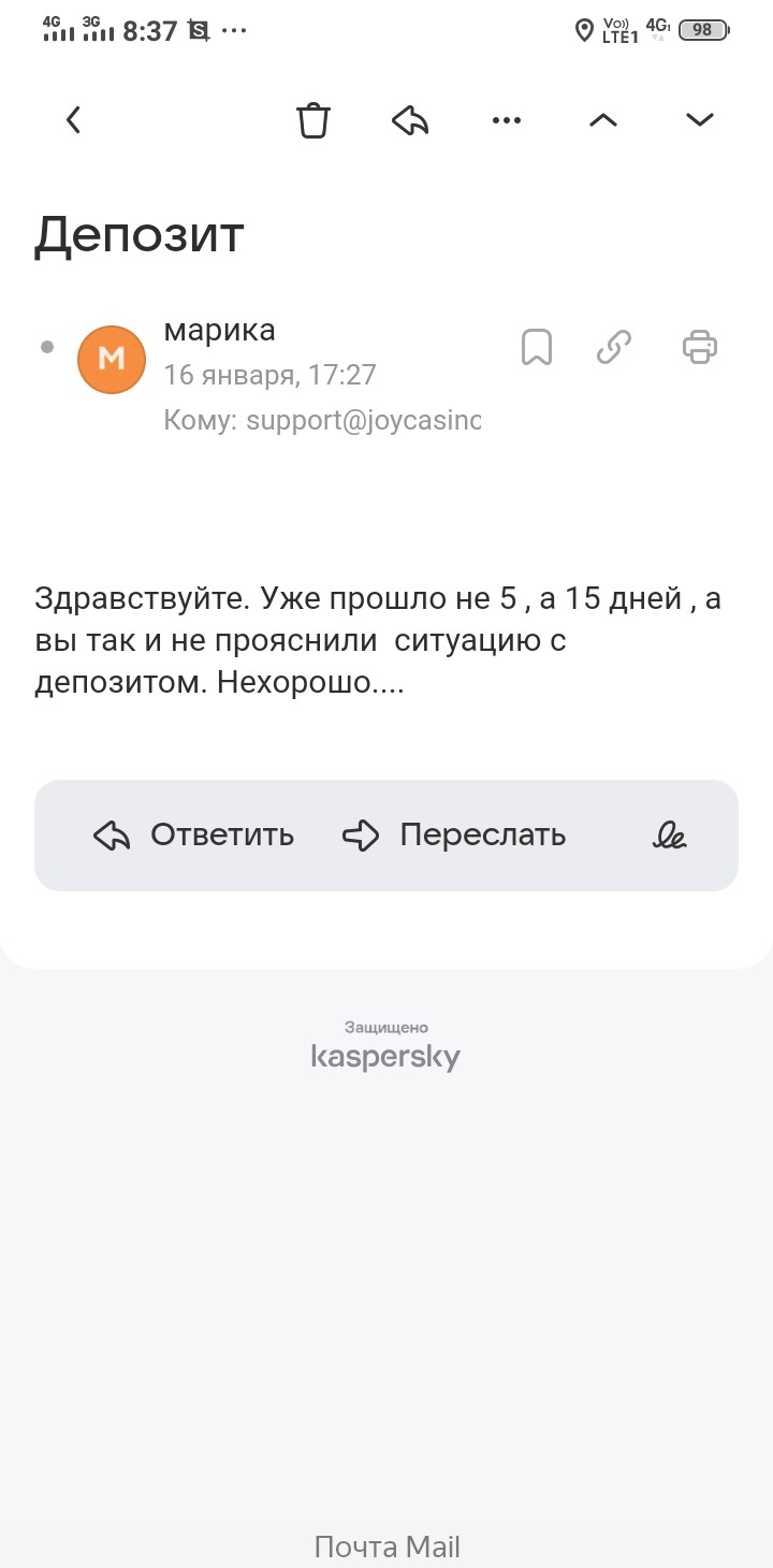 Здравствуйте. 31 декабря пополнила игровой баланс на 1024 руб., но на игровой счёт деньги не пришли . В этот же день был предоставлен чек о списании данной суммы с карты на электронную почту казино , через два дня предоставила выписку по карте. Каждый день писала им на почту , ответ пришел только 13 января ," что вопрос о не поступившем депозите вскоре будет решен " , 18 января мне ответили , что не удалось найти средства на стороне провайдера. Как не нашли ? В чеке и выписке четко видно на какую карту и в какое время списались деньги Техподдержка работает отвратительно , на письма не реагируют , мне только через две недели ответили , хотя обещают "мы ответим в течении 3-х дней".. Считаю , что вина на казино , т.к. две недели не занимались решением проблемы игрока , время упустили и оставили меня без средств. Депозит должен поступить на мой игровой баланс